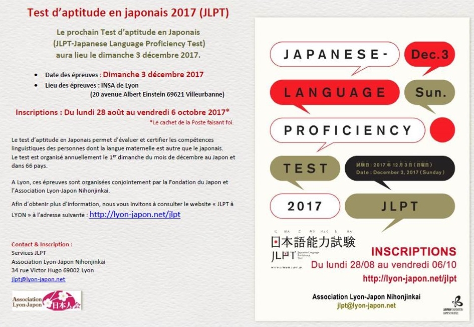 Le prochain Test d'aptitude en japonais (JLPT, Japanese Language Proficiency Test) aura lieu le dimanche 3 décembre 2017 à Lyon.